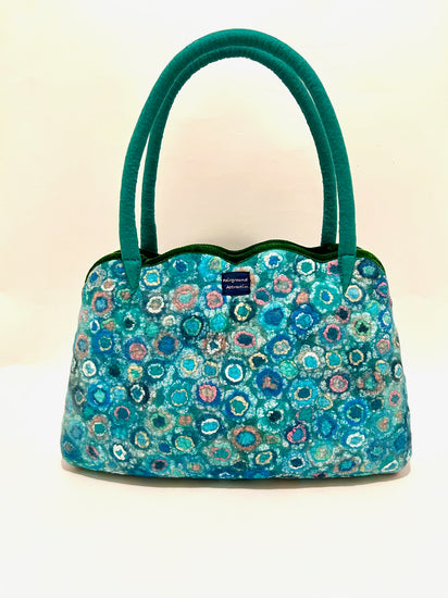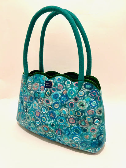 本体のグリンに合う色にグリン系の寒色系と一部にピンクで配色いたしました。持ち手を長くし、お花模様の総柄仕様です。大きい形のスカラップトートになります。