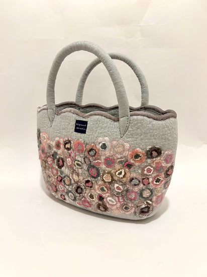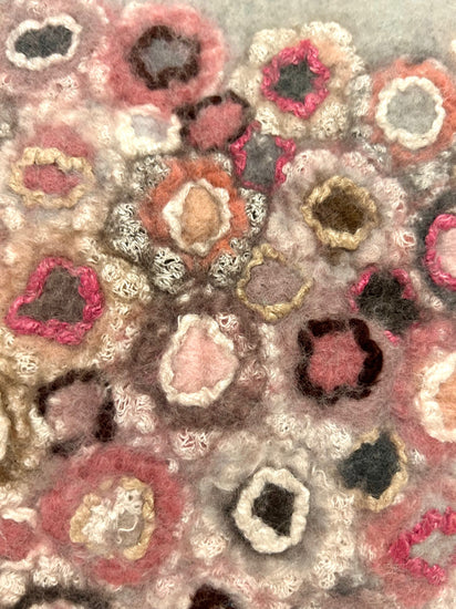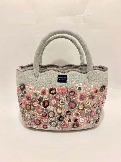 模様の部分は、薄い羊毛シートを作り、パーツを4層重ねて一つの花の模様を作っています。ライトグレイの本体に合う様に、ピンクとグレイ系の色味でまとめました。