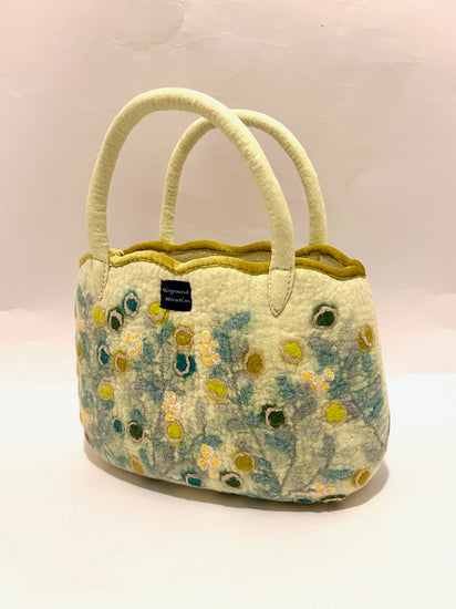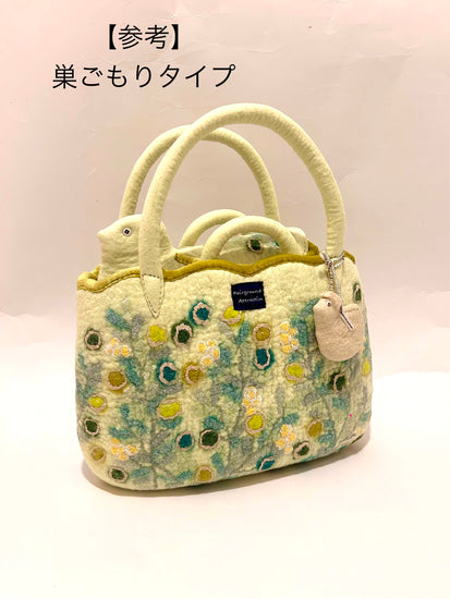 もともと、石鹸水で制作しているので、雨にあたって形が崩れることはありません。 羊毛は摩擦に弱いので、使い始めは若干の毛羽立ちができますが、小さな毛玉でも手で引っ張らず、ハサミでカットして下さい。汚れた場合は、手洗いなど水洗いもできますが、起毛しているので、汚れは目立ちにくいです。経年変化で羊毛がだんだんと固く締まって、その風合いもお楽しみいただきたいと思いますが、気になる方はご相談ください。持ち手などのパーツを外して、水洗いが可能です。上質な羊毛を使用しているので、シーズンオフで押入れなどに仕舞われる時は、防虫剤と一緒に保存袋に入れて保管して下さい。