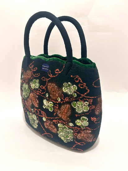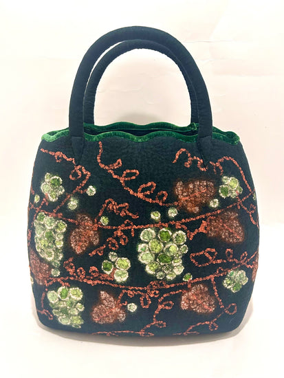 羊毛と異素材の組み合わせ。シルクの糸やシルクオーガンジーで葡萄模様を作っています。スカラップ型のバッグ口の飾りには、グリンの別珍を使用しています。
