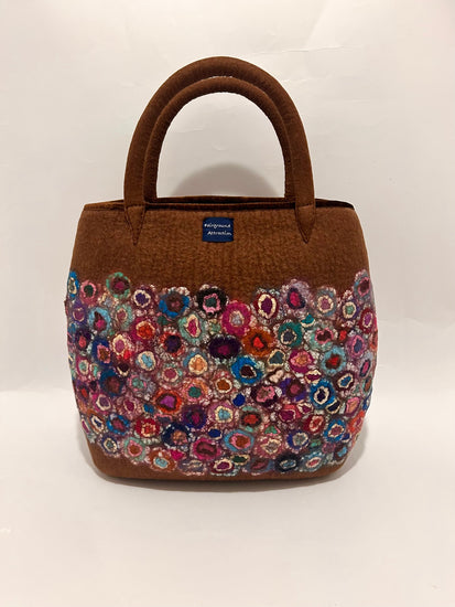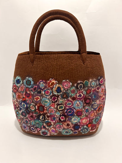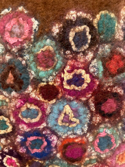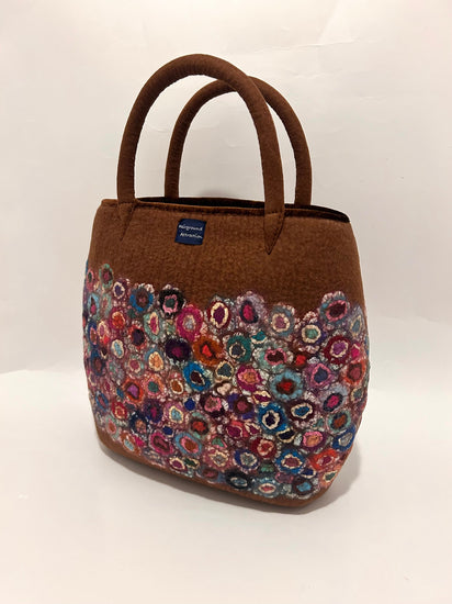 模様の部分は、予めいろんな色で薄い羊毛シート(プレフェルト)を作り、ハサミでカットしたものを手置きしています。お花の模様部分には、本体の色に合わせてマルチカラーで配色しています。花びらに見えるように4種類の個々のパーツを重ねて一つのお花を構成しています。縮絨すると、シルクは羊毛に引っ張られて波模様になったり、ベース色と混ざってグラデーションになったり、縮絨が進むにつれて色が変わってきます。テキスタイルとしての面白さがあり、形も模様も、全てが1点ものの作りになっております。