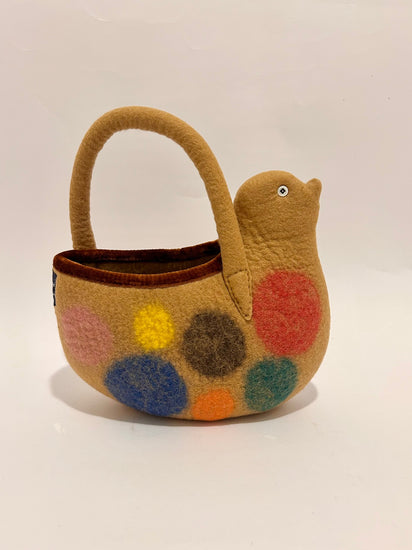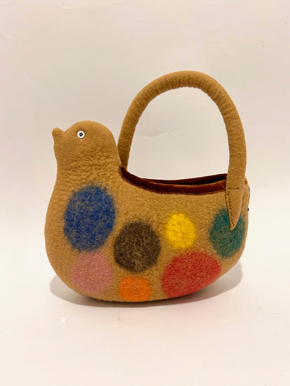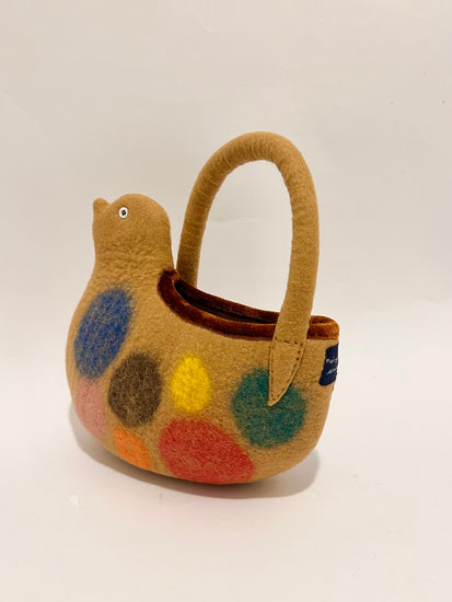 もともと、石鹸水で制作しているので、雨にあたって形が崩れることはありません。 羊毛は摩擦に弱いので、使い始めは若干の毛羽立ちができますが、小さな毛玉でも手で引っ張らず、ハサミでカットして下さい。汚れた場合は、手洗いなど水洗いもできますが、起毛しているので、汚れは目立ちにくいです。経年変化で羊毛がだんだんと固く締まって、その風合いもお楽しみいただきたいと思いますが、気になる方はご相談ください。持ち手などのパーツを外して、水洗いが可能です。上質な羊毛を使用しているので、シーズンオフで押入れなどに仕舞われる時は、防虫剤と一緒に保存袋に入れて保管して下さい。