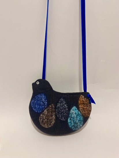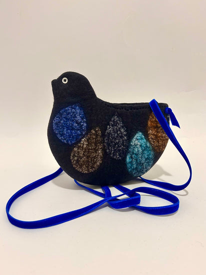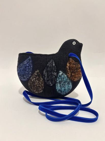 しずくの模様パーツにはシルクオーガンジーを使用しています。右肩掛け仕様でロイヤルブルーの別珍リボンを使用しています。