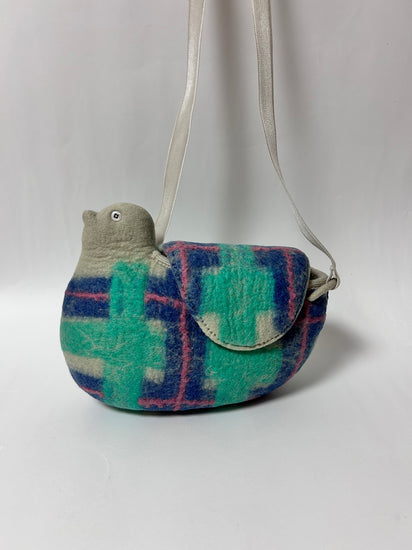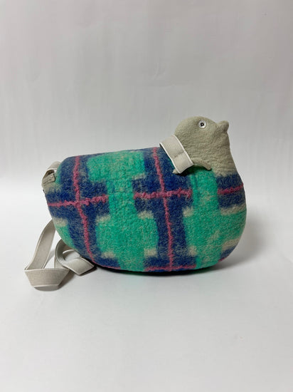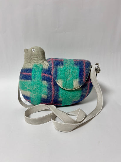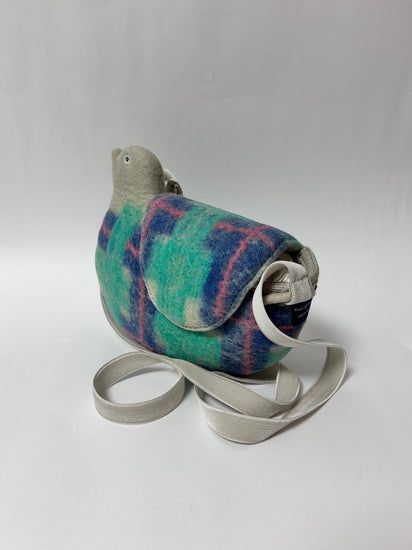 ねこやなぎ色をベースに、ブルー×ミントのチェック模様になります。プレフェルトや毛糸(ピンク)を使ってチェック模様を作っています。被せになる大きな羽の様なフタがついています。ホックで留める仕様です。肩ひもが付いているタイプ。リボンには別珍を使用しています。
