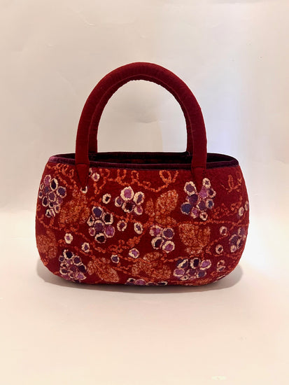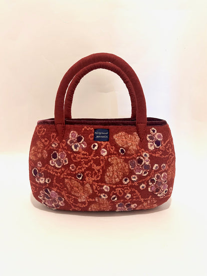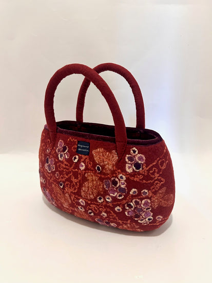 羊毛と異素材の組み合わせ。シルクオーガンジーやシルクの糸でアグレッシブな蔦を描いています。バッグ口の飾りには、明るい紫(アヤメ色)の別珍を使用しています。