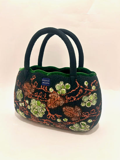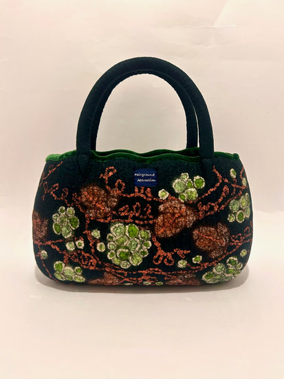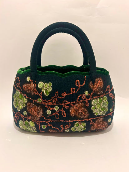 バッグ口は、スカラップで、縁飾りには、グリンの別珍を使用しています。