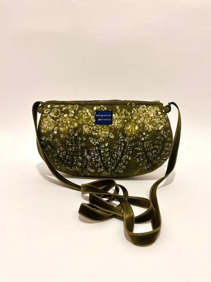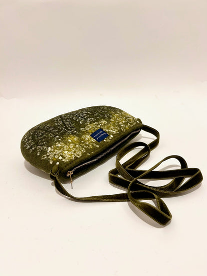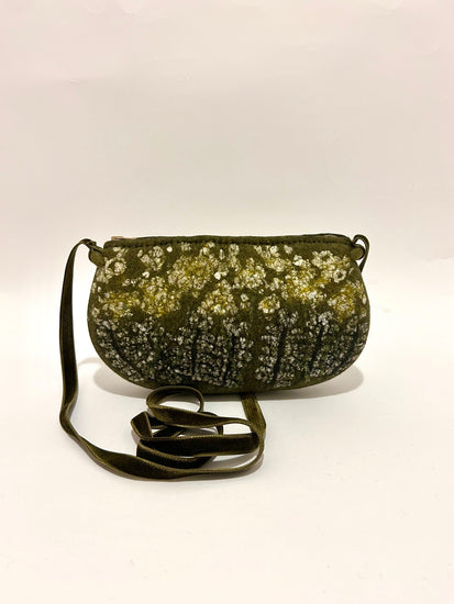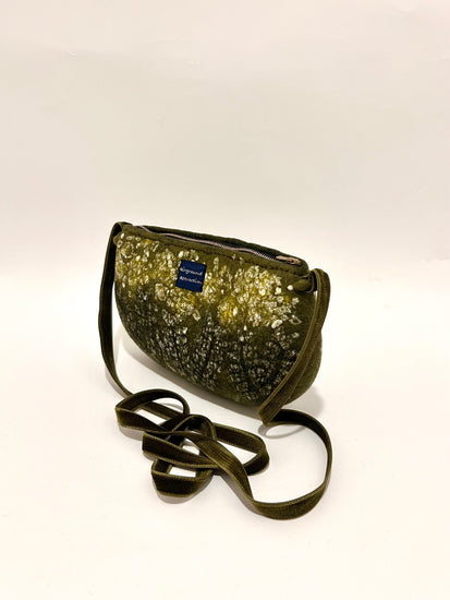 表(カーキ)と裏側(黒)の色が違うので、全体的にはニュアンスカラーです。葉っぱの色も黒を使用しているので落ち着いた雰囲気になっています。バッグ口には20cmのファスナーを使用しています。ループを取り付けて肩紐は別珍リボン、本体と同じカーキを使用しています。希望があれば、長さを調整します。