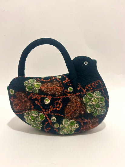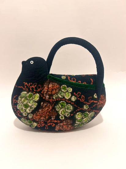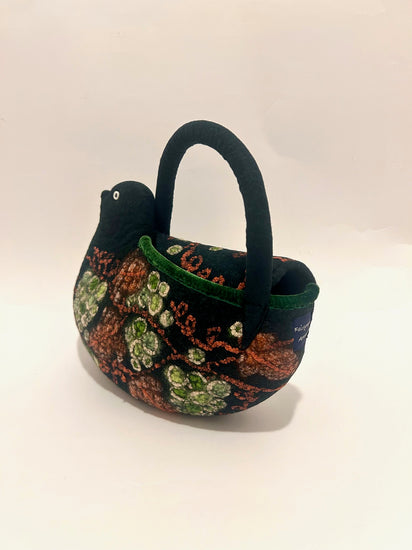 羊毛と異素材の組み合わせ。シルクオーガンジーやシルクの糸でアグレッシブな蔦を描いています。バッグ口の飾りには、本体が黒に近いグリンなので(緑色)の別珍を使用しています。