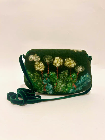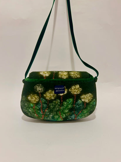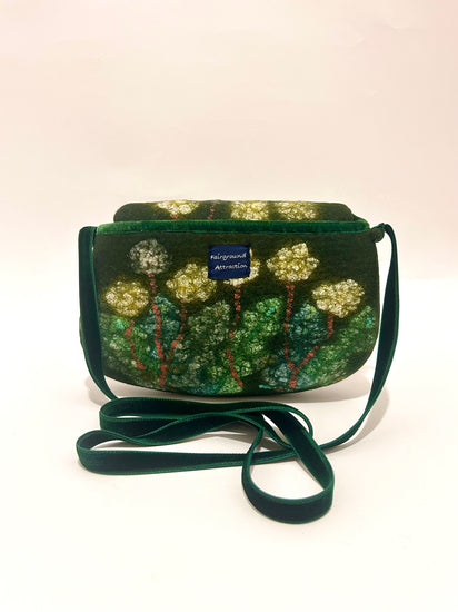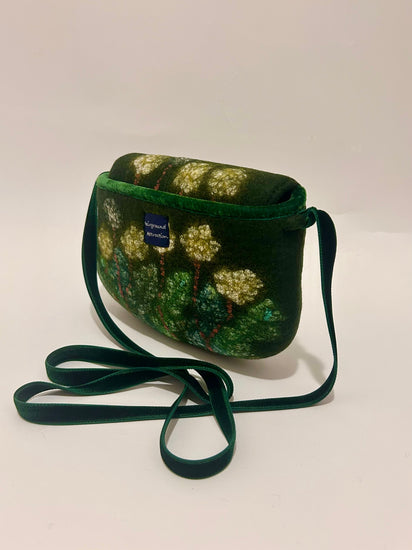 全体的にグリンでまとめました。肉厚な被せるタイプのフタが付いているので、ホックやファスナーは付いておりません。バッグ口の飾りテープと肩紐に別珍リボンを使用。贅沢なダブルフェイス仕様になっております。